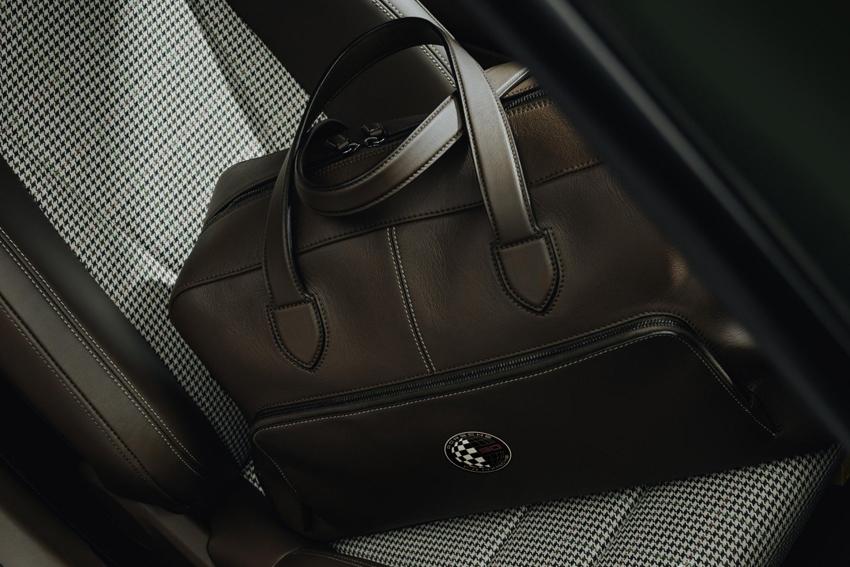 La voiture sera livrée avec un sac de week-end de même type que le véhicule. Il est composé de cuir de teinte brun truffe avec des coutures décoratives Beige Calcaire. Il est doublé de tissu Grid-Weave F.A., le même utilisé sur les bandes centrales des sièges tandis que le compartiment principal est revêtu de microfibre haut de gamme. La plaquette portant le logo anniversaire qui est apposé sur la grille du capot arrière est brodée sur la poche extérieure du sac de voyage.